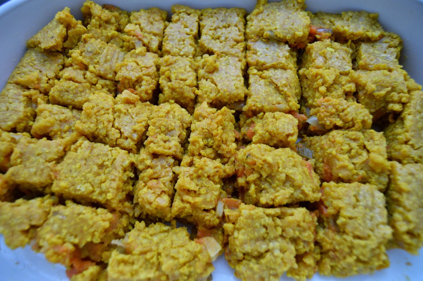 – En un molde ovalado, forrado con papel vegetal, colocar una capa de mijo, otra de crema de boniato y, de nuevo, otra de mijo. Apretarlo con una pala humedecida y dejar reposar para que tome consistencia.