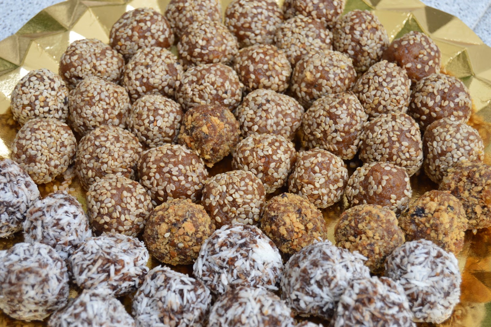 – Colocar el sésamo, el coco y el cacao en diferentes platos y pasar por éstos cada bolita hasta que queden bien cubiertas.